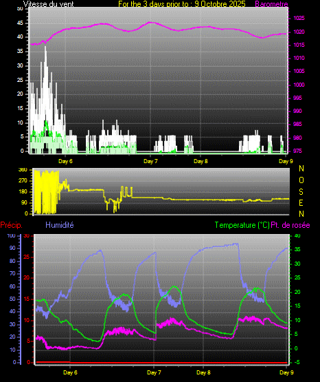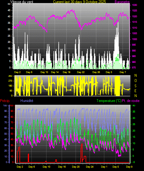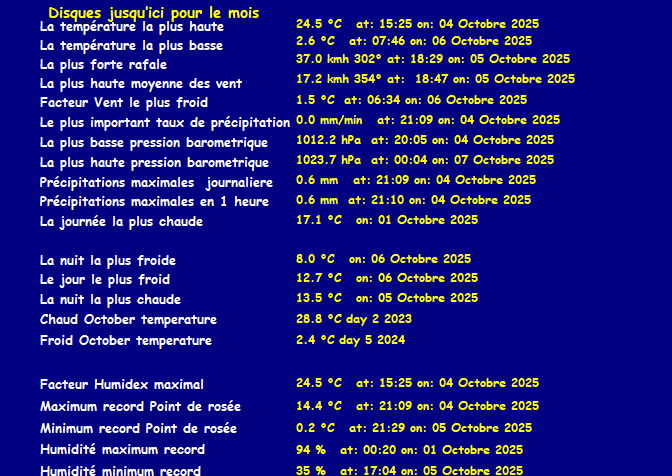 Précipitation maximum par minute (dernière heure) | 0.0 mm/min | Précipitation maximum par heure (dernières 6 heures) | 0.0 mm/Heure |