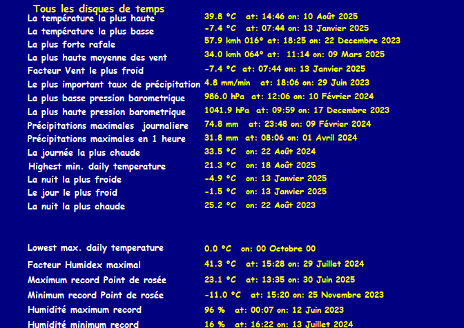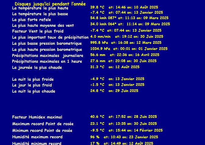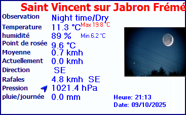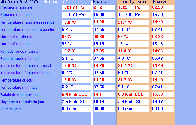 Temperature Maximum (depuis minuit) | 19.8°C at: 14:20 | Temperature Minimum (depuis minuit) | 6.2°C at: 07:56 |